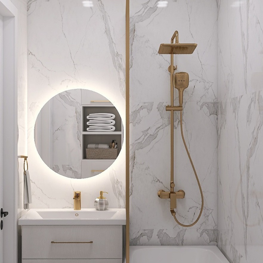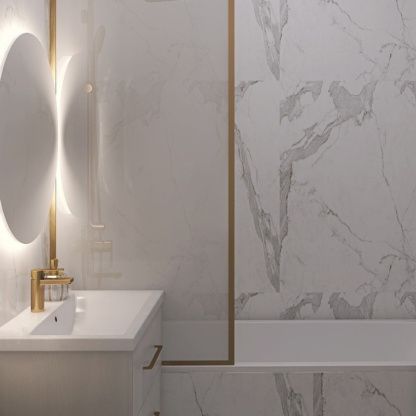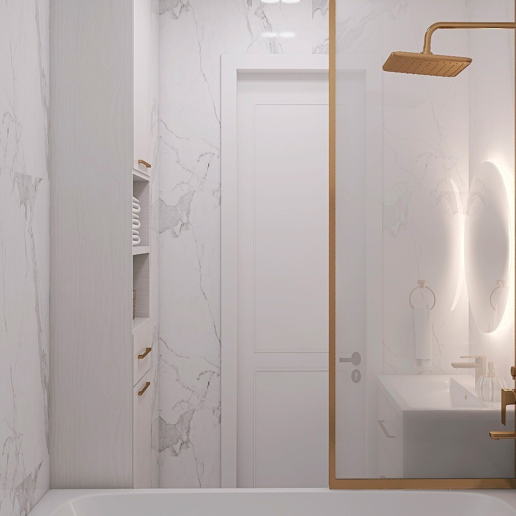 В ванной комнате мы использовали керамическую плитку на полу и на стенах, которая была запилена под углом 45 градусов. В ванной также установлена современная душевая система, раковина, инсталляция и система от протечки воды. Для обеспечения комфорта и хранения личных вещей, полноценный шкаф-пенал глубиной 40-50 см вместо обычного навесного шкафчика.